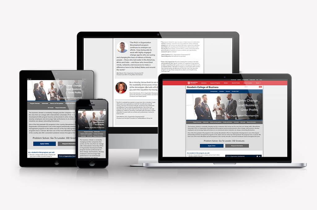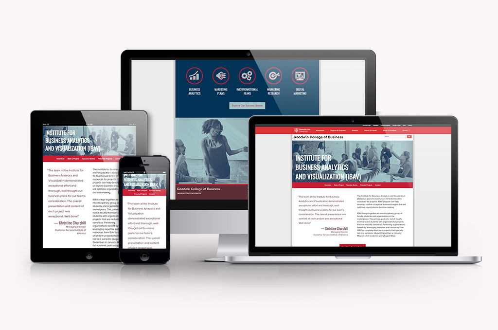 The Institute for Business Analytics and Visualization, an organization facilitating partnerships between local businesses and students at the Daniel L. Goodwin College of Business for marketing and analytics projects, was in need of a web presence to promote its services. Potential business and corporate partners were identified as the initial target audience, with content streamlined to highlight testimonials and success stories.